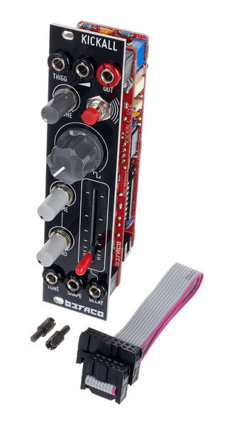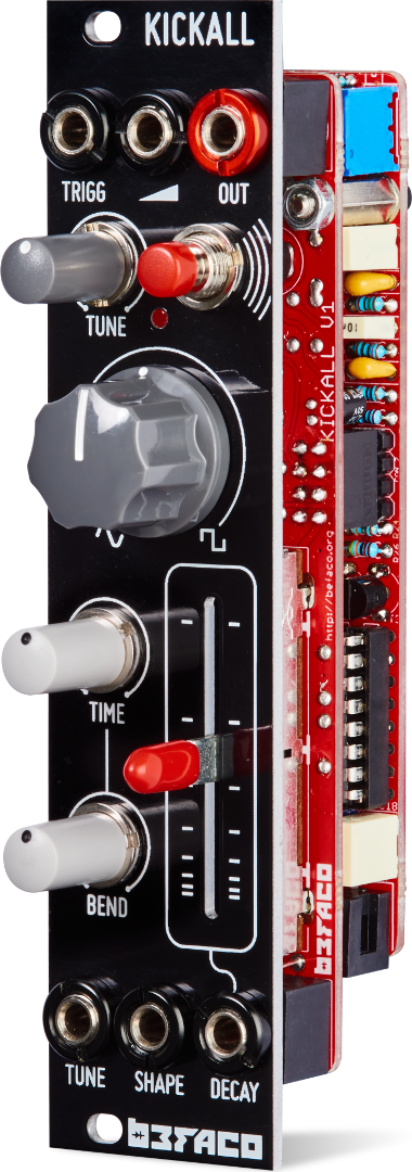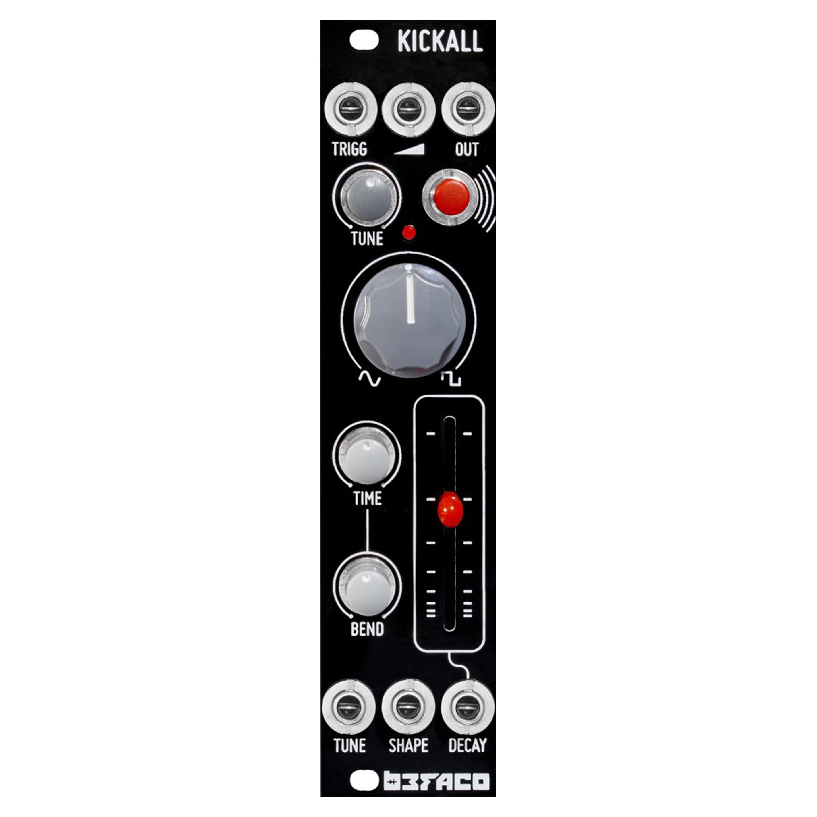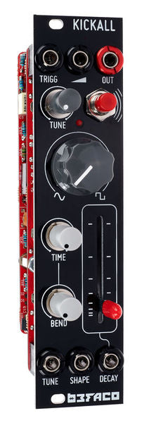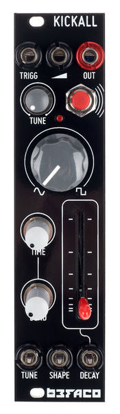 Kickall is a 6HP compact synth voice that features everything needed to make a big fat Kick sound: A stable VCO that tracks V/Oct, a couple of VCAs, envelopes for volume and pitch and an aggressive wave shaper.