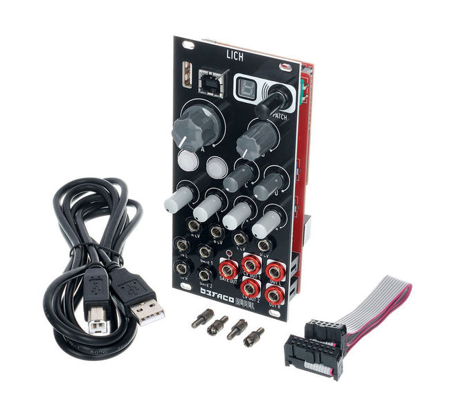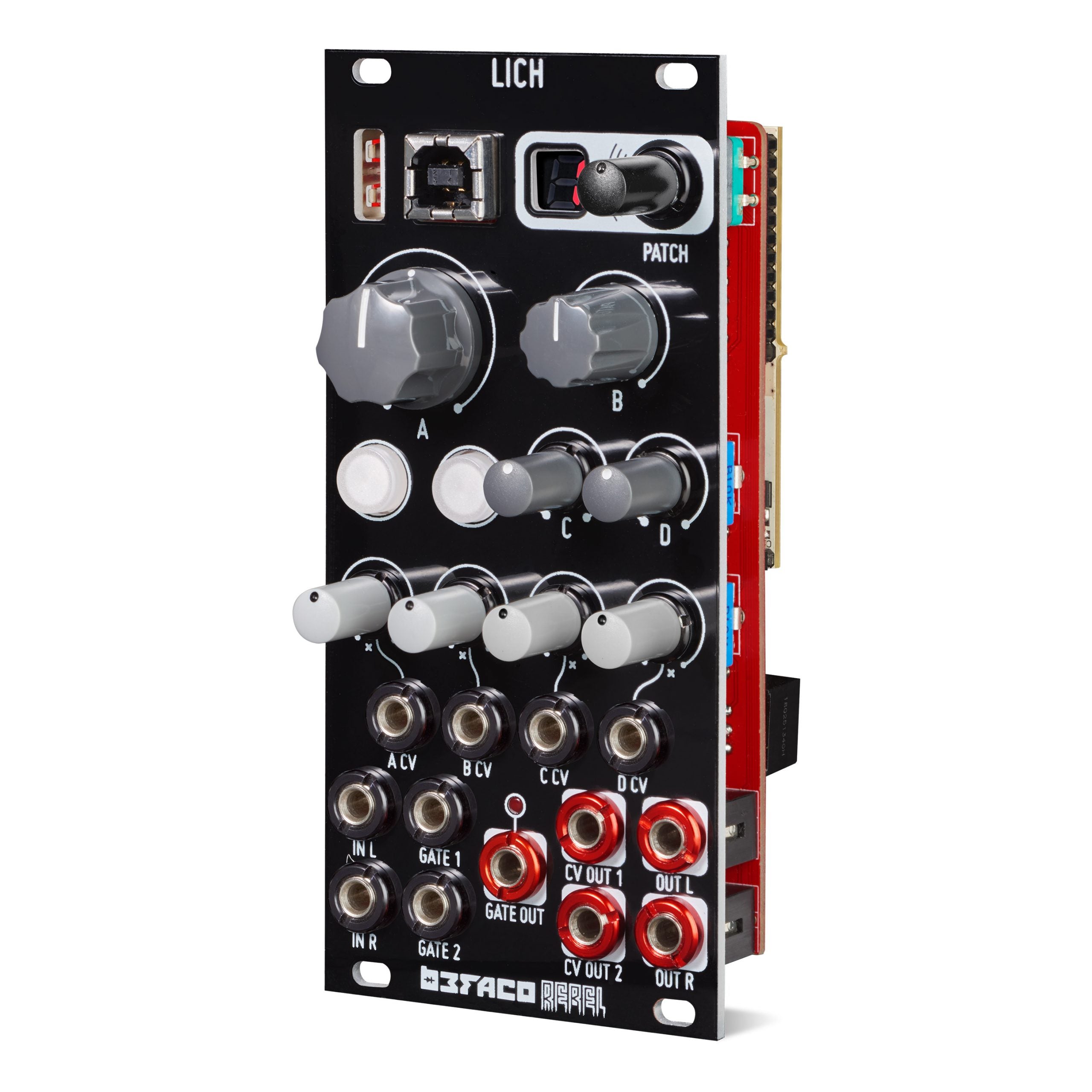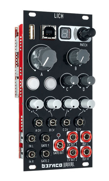 Lich is a programmable multi-function module based in Rebel Technology OWL platform that allows you to use Pure Data, Max Gen or Faust code into your module! This is a Befaco Rebel collaboration that brings back Owl’s platform with this new hardware iteration. It has stereo in and out, four pot controls summed to cv inputs (like the classic Owl module) And as addition, CV and Gate outputs, patch selection with display and USB MIDI host and device connections.