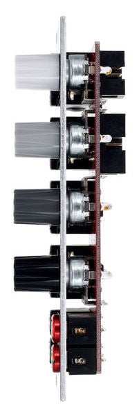 STMix is a compact 4 channel stereo mixer with an auxiliar input. This input will allow us to chain a few of them or to insert an extra fifth input.
