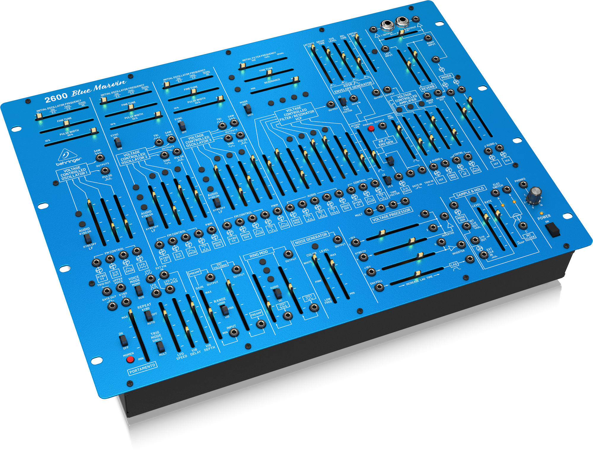Extensive modulation options are possible for oscillators and filters via predefined signal path and free wiring of all sections via patch cables (3.5 mm jack)