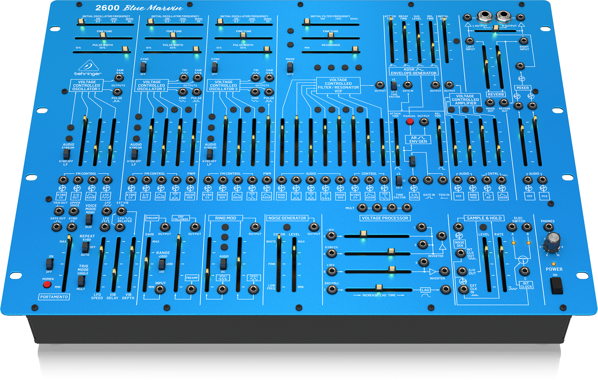 Oscillators 2 and 3 with switchable oscillator synchronisation and outputs for triangle, sawtooth, sine, and pulse