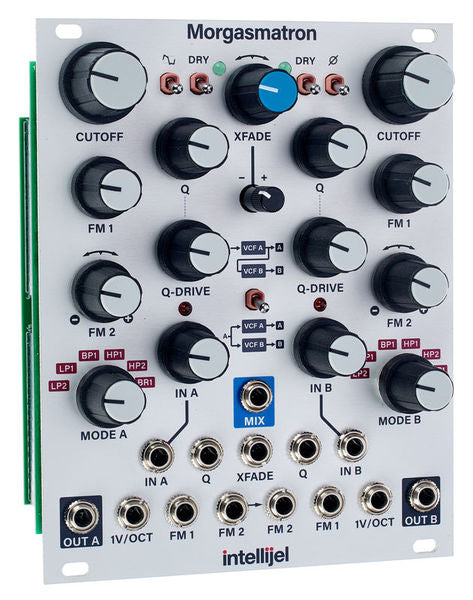 This is the third generation of Intellijel’s much loved Korgasmatron filter designed in collaboration with David G. Dixon. For obvious reasons, we considered naming it the Korgasmatron III. But once we experienced the purity and range of its finely re-tuned filters; the warmth of its soft-clipping; the beefiness of its Q-DRIVE; the aggressive howl of its all new overdrive circuit; the additional XFADE options; and its clangorous new ring modulation capabilities, we knew it was something much more than a Korgasmatron III. It was a MORgasmatron!