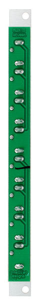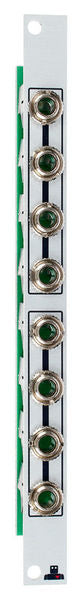 Mult is a dual 4-way passive signal multiplier. It takes one audio or cv signal, and routes it to up to three multiple unbuffered outputs. It requires only 2HP of width, and because the Mult is a passive module, it requires no power to operate.