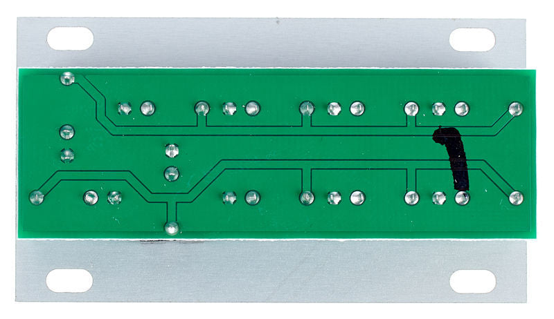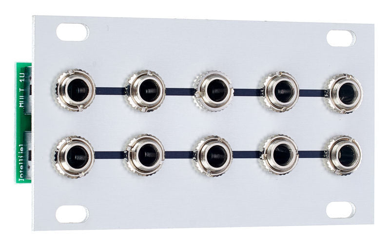 Mult is a dual five-way passive signal multiplier. Plug an audio or CV signal into any of the five top jacks, and Mult 1U sends an unbuffered version out the other four jacks in the group (thereby “multiplying” one signal into four). The bottom row duplicates this function, giving you two independent multipliers in a single module. Because the Mult is a passive module, it requires no power to operate.