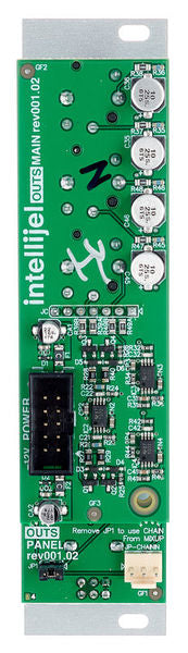 To use Outs, simply connect the final output of your patch to the ⅛” inputs. The built-in activity LEDs light up to indicate the presence and intensity of the input signal. The left input is normalled to the right, so you can create a stereo signal from a mono source. Or if you have an Intellijel Mixup, you can remove a jumper from its rear panel, and connect it to the Outs module using the 3-pin link cable included with the Mixup.
