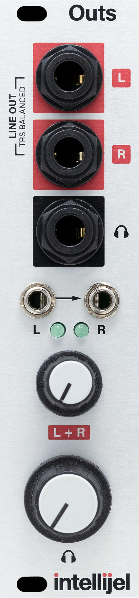 Outs enables your modular system to output both professional and prosumer compliant audio, and send it to external amplifiers, mixers, recording devices, or DAW interfaces. Using the L+R Level knob, it scales modular-level voltages down to the level required to drive external gear at either the +4dBu balanced professional line-level standard or the -10 dbV unbalanced standard.