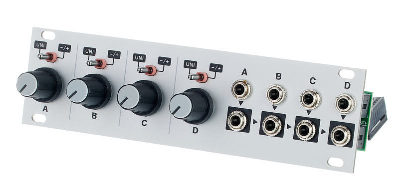 The four handy knobs can act as active attenuators (unipolar) or attenuverters (bipolar) depending on the setting of the two-position switches above each channel.