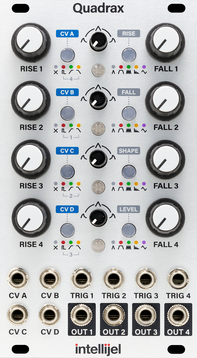 The Intellijel Quadrax consists of four independent, CV-controllable channels, each of which can be configured to perform any one of the following functions: