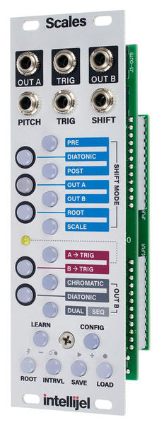 Scales features two independent outputs, enabling you to create shifted harmonic intervals within your chosen scale using only a single pitch input. Using the SHIFT input you can modulate changes on OUT A and/or OUT B.