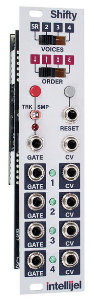 Shifty is a combination of four sample and hold stages, a sequential gate, and a sequencer controller. This collection of functions allows for some inspiring and useful utility applications, such as clock dividing, or controlling up to four voices with intricately evolving melodies or chord changes.