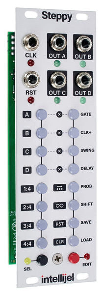 Steppy is a 4-track programmable gate sequencer with eight internal memory slots, external clocking, numerous tweakable parameters, and a performance-first design aesthetic.