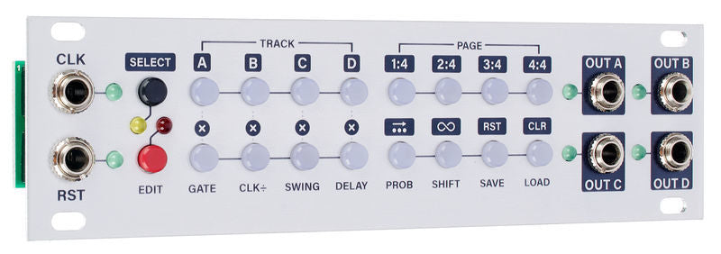 Each track has its own length, which can range from 1-step to 64-steps, allowing for polyrhythms, fills, or constantly evolving gate interactions between tracks.