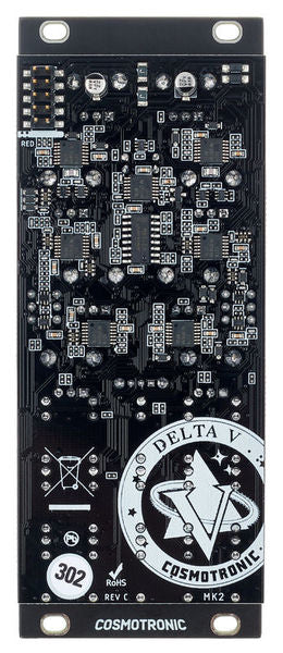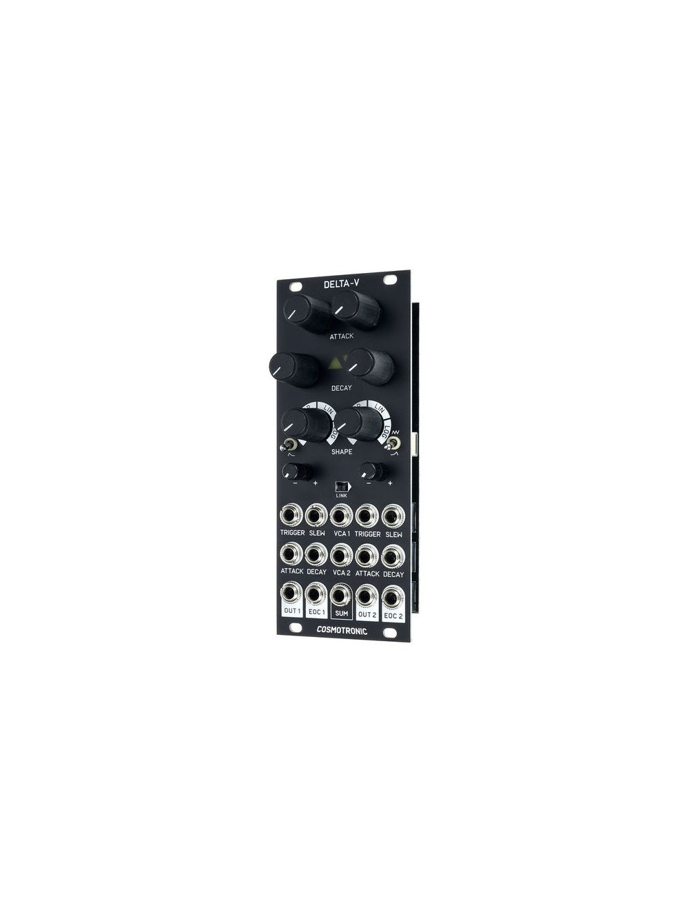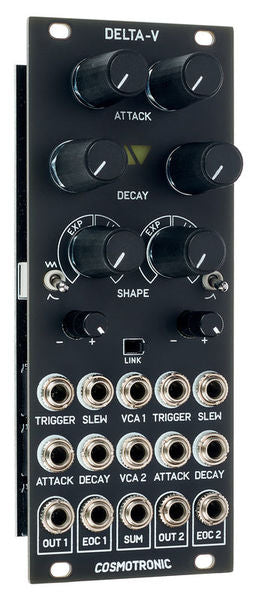 The Cosmotronic Delta-V is a two-channel analog function generator great for making envelopes, LFOs, and adding slew to control voltages. Delta-V’s outputs are sculpted using the attack, decay, shape, and amplitude controls. There is a trigger input for creating attack/decay envelopes and a slew input for adding portamento to CV or generating attack/sustain/release envelopes from gate signals.