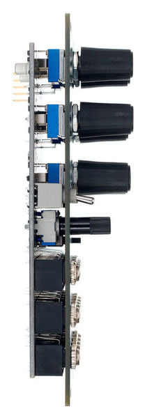 Both envelopes have looping functionality and an end of cycle gate output. Further animation of the Delta-V can be achieved using the attack and decay CV inputs. The Delta-V features two VCA inputs. If an audio rate signal is applied to the VCA input, the envelope will modulate its amplitude. If a sub-audio signal is input at the VCA, it will control the amplitude of the envelope.