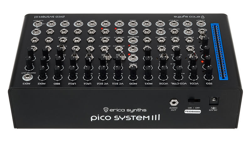 The system has 31 inputs and 20 outputs (master output is duplicated) + 7 switches; if you have enough patch cables at your disposal, you can patch the system in 121000931215044250740178662400 or 1.21x1029 variations (we ignored the possibility to adjust potentiometers here). Even though only 0,0001% of all patches will sound more-less enjoyable, you and all your future generations can spend a lifetime only patching the Pico System III.